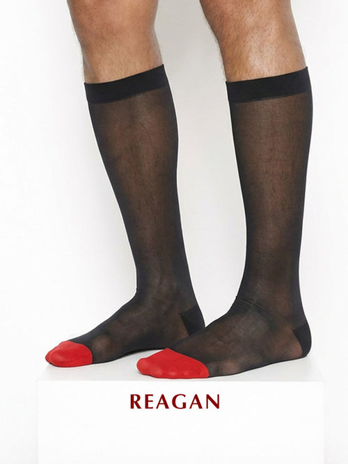 B312 Chaussettes habillées transparentes pour hommes, chaussettes de mariage rayées avec bout rouge -